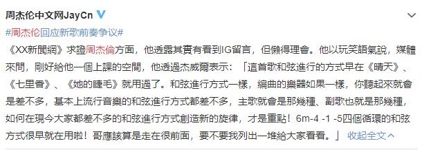 不过对此,据周杰伦中文网的消息,周杰伦在接受某媒体采访时回应此事:“这首歌和弦进行的方式早在《晴天》、《七里香》、《她的睫毛》等歌曲就用过了。和弦进行方式一样,编曲的乐器如果一样,你听起来就会是差不多,基本上流行音乐的和弦进行方式都差不多,主歌就会是那几种、副歌也就是那几种,如何在现今大家都差不多的和弦进行方式创造新的旋律,才是重点!哥应该算是走在很前面,6m-4-1-5 四个循环的和弦方式很早就在用了啦,要不要我列出一堆给大家看看。”