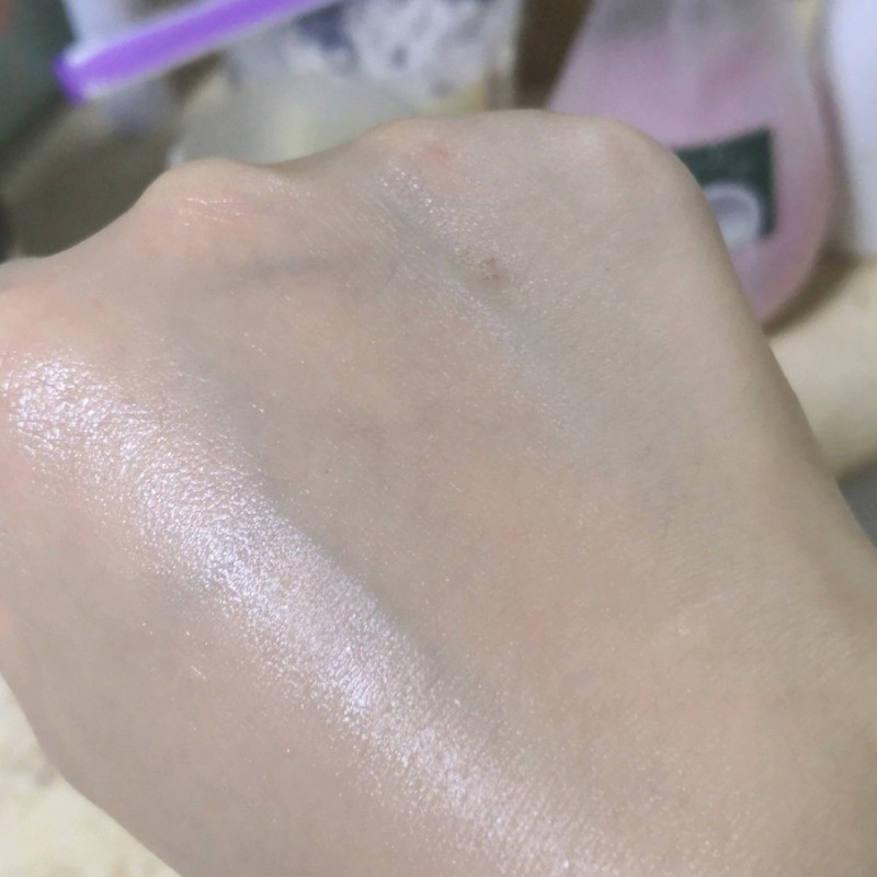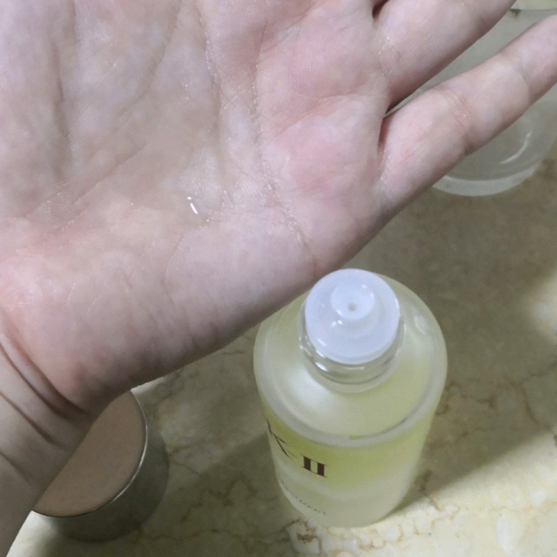 滴一滴在掌心可以看到它的水质很清透,流动性很好,拭擦手背对比,比较清爽,皮肤吸收很快,可以看到皮肤比较清透软嫩,保湿效果较好。