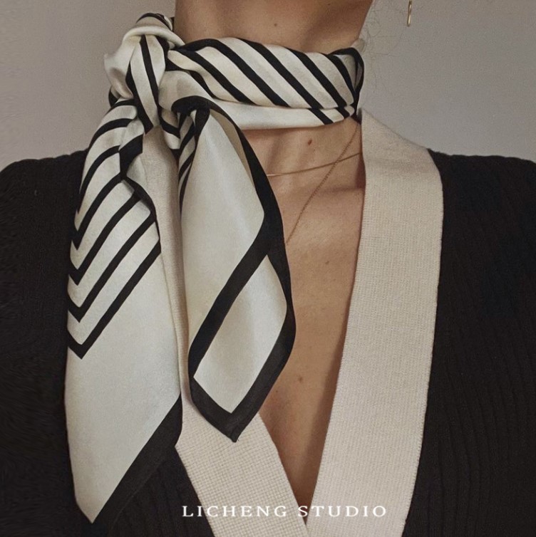 在炎热的夏季,长丝巾可以选择搭配大领或者v领衣服,有防晒的效果,系上丝巾后可以隐约看见锁骨线条,若隐若现的感觉最迷人了。在春秋季可以搭配衬衫,白色衬衫或者单色调衬衫都好看,时尚又复古。冬季可以搭配羊毛衣和大衣,保暖又时尚,还可以协调整体穿搭,很受用哦。