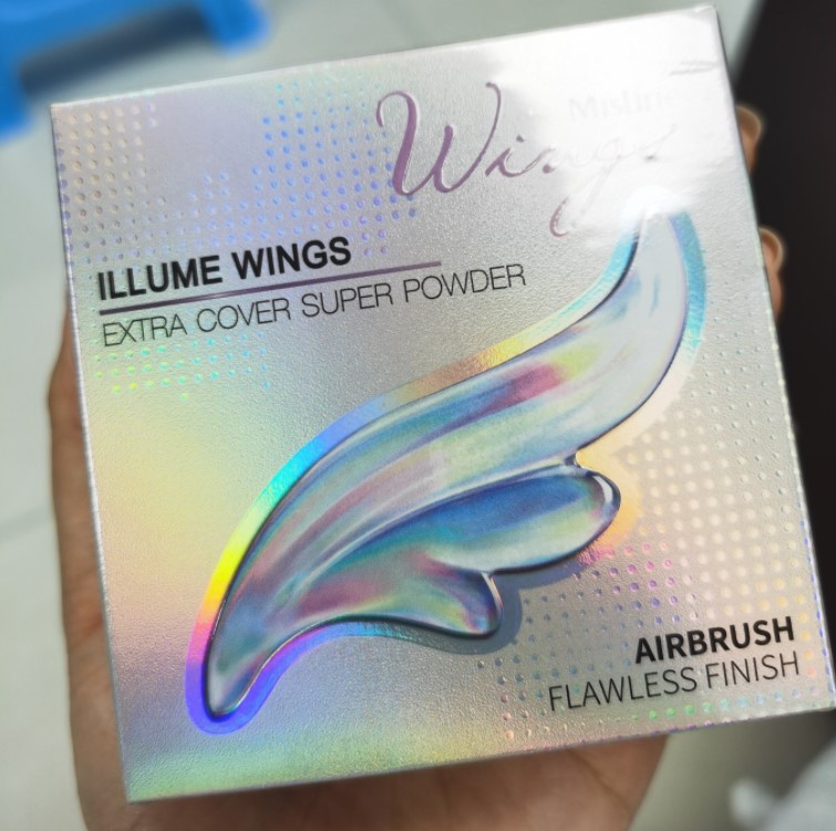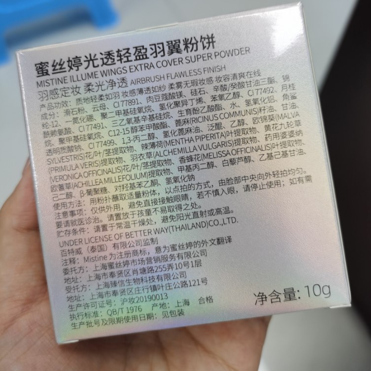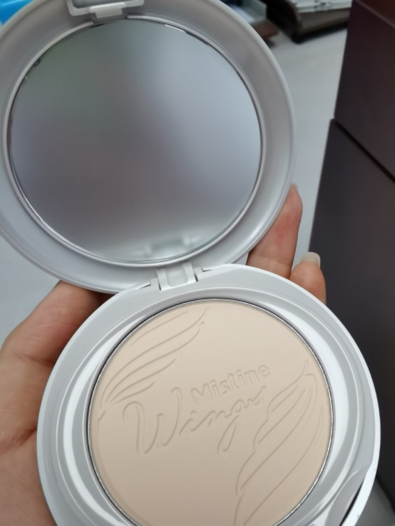 包装上的羽翼超级闪亮,极光,果然名副其实,很控油,Mistine还不错的品牌,妆面效果粉雾面妆感,刚拿到就被这个惊艳到了!而且出门带着补妆很方便。