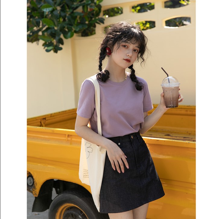 牛仔裙是比较休闲、时尚又百搭的裙子,浅蓝色牛仔裤A字裙是很适合夏天穿的,搭配一件紫色露肩上衣,时尚、个性又洋气。