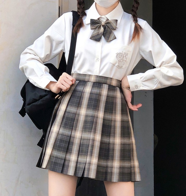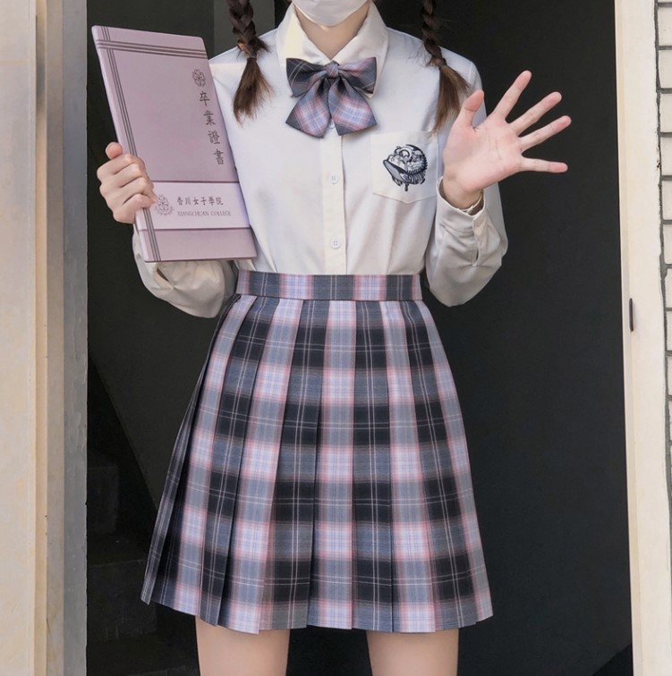 JK制服则为女子高中生制服。JK为日语流行语,意为女子高中生。取假名音jyoshikoukousei中的J和K,所以jk不等于jk制服。jk制服根据领子外形不同分为札幌襟,关东襟,关西襟,名古屋襟四个种类,又根据领子上的襟线多少、颜色不同分为繁多的类型,襟线的颜色以及数量就是辨别类型的标准,如:赤三本、黑一本、白无本等。亲子线就是一宽一细两条襟线;还有变形襟,但本质上都是jk制服。JK制服裙子根据褶皱排列不同有不同称呼:大抵为箱褶,轮褶,前箱褶,还有比较少见的重褶,其中轮褶最为常见。轮褶的褶子为全往一个方向一个压着一个,多为逆时针方向,也就是右边压着左边。轮褶的褶数可以分为16,20,24,28,32,通常为24褶。