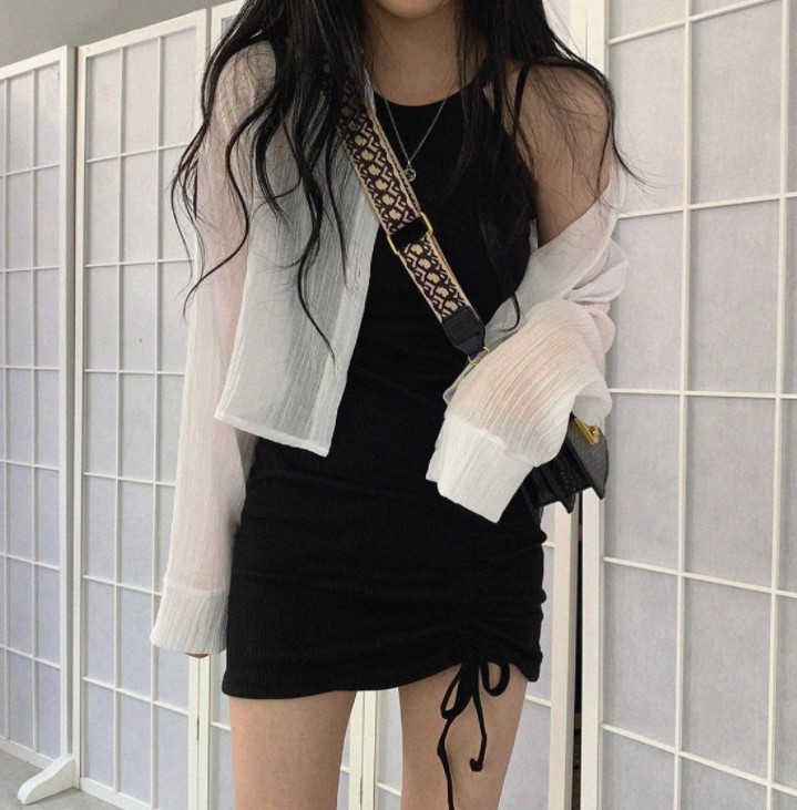 黑色是一种很深的颜色,有着收缩视觉的作用。在颜色搭配上,遵循上浅下深的颜色,能够让腰部的位置看着更细一些。夏季的阳光这么大,不想让阳光将手臂、肩膀肌肤晒黑的话,外搭上一件浅色的防晒衣也会是不错的选择。