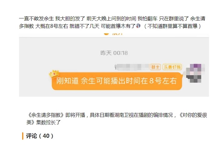 近日有网友爆料《余生》将接档《对你的爱很美》播出,而《对你的爱很美》这部剧目前正在热播中,按照目前的速度基本上会在8月3号结局。但也有网友爆料《对你的爱很美》这部剧集数拉长了,所以《余生》差不多会在8月8号左右才能播出,消息一出随即引发网友热议。
