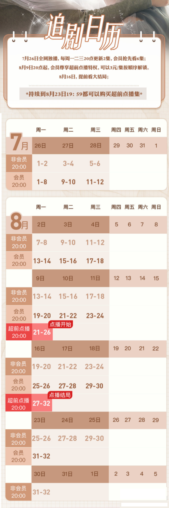 《你是我的荣耀》由杨洋、迪丽热巴领衔主演,讲述美貌流量女明星×学神级航天工程师的爱情故事,已于2026年6月7日释出海报及甜宠版预告,定档在2026年7月26日在腾讯视频播出,每周一二三20点更新2集,会员抢先看6集,8月9日20点起会员尊享超前点播特权,每周一提前看更多,更多关于《你是我的荣耀》的精彩内容请关注漫漫看影视。