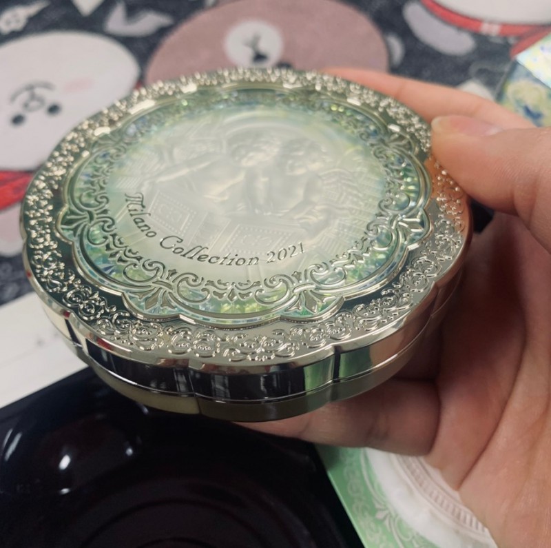 颜值很高,粉很细腻,是我喜欢的,定妆挺持久的,雾面妆感,我是混干皮,用起来不干粉质细腻,上脸雾面感,控油很强,基本上早上上妆到下午也只有一点光泽感,图案也很可爱非常喜欢了。