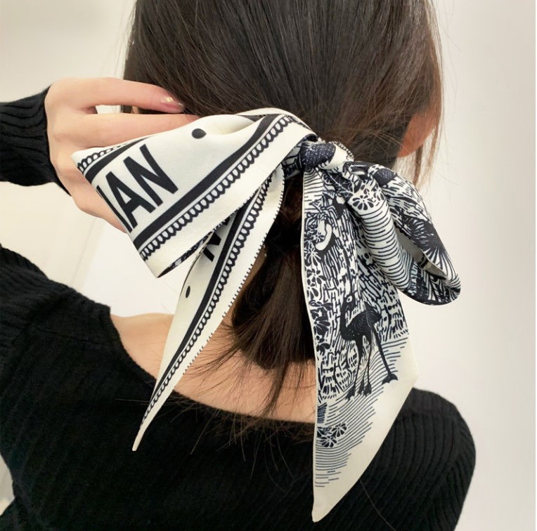 侧边打结也是常用款之一,比起正面蝴蝶结,侧面打结显得更加灵动一些,有点小女生的趣味感,非常适合色彩艳丽的小方巾。