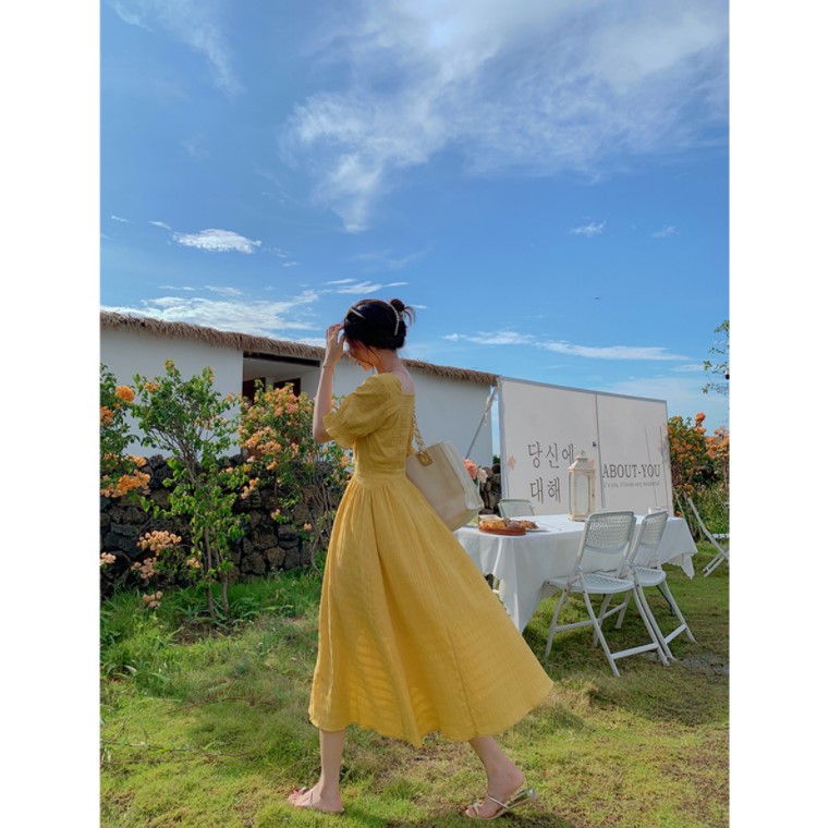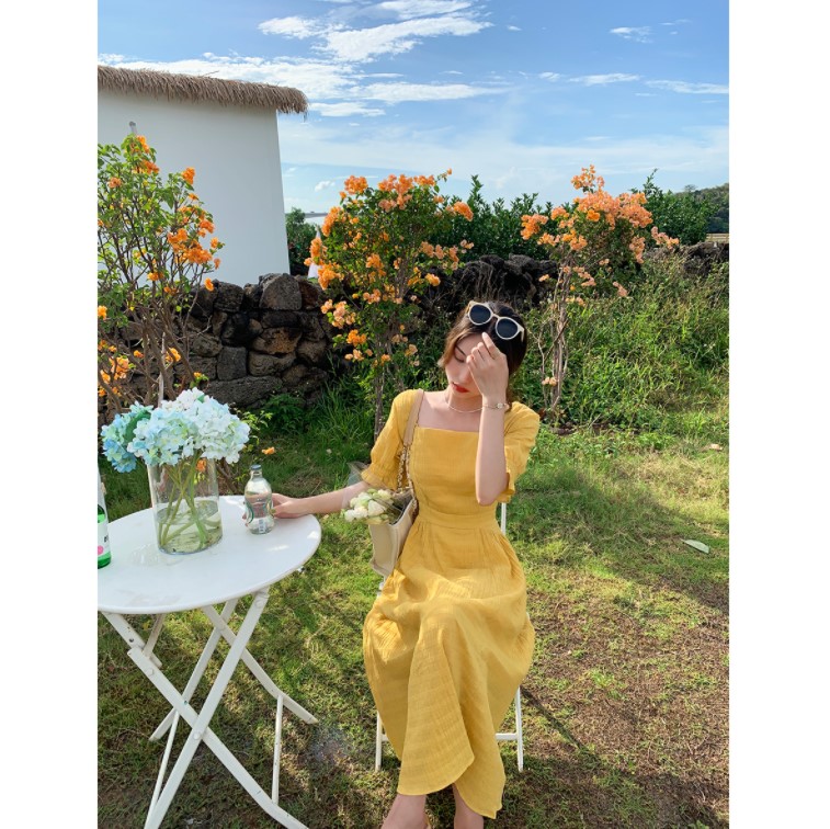 肤色较黑的妹子可以选择浅色的黄噢~总之明亮度要稍微高一点,把整体的气色提起来。像这件浅黄色的裙子就很适合啦。