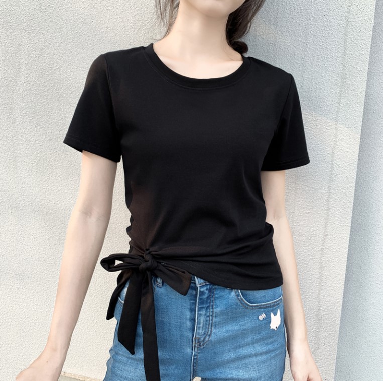 t恤不用多说,大家都知道是一个很百搭的衣服品类,夏天穿起来舒服透气,也不会很热,女生传出去就想有不一样的地方,打结也是一种方式。