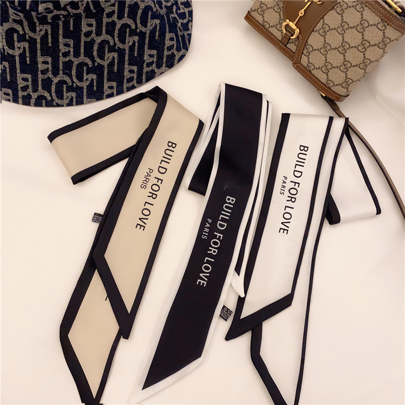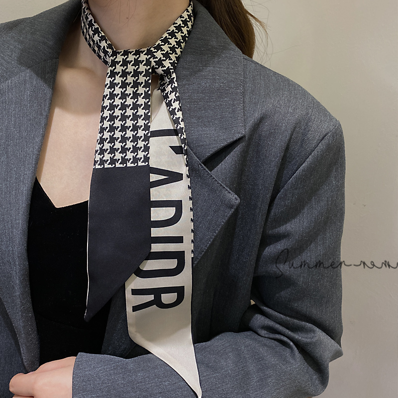 极其轻薄的长条状丝巾拥有渐变效果的边缘,整齐的折叠后置于衬衫内,不同于普通的系法,干练而利落。