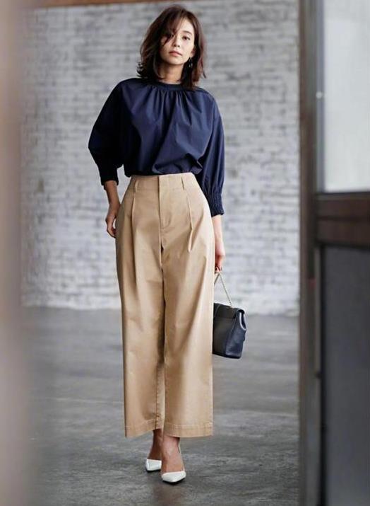 这款卡其色阔腿长裤配合的是藏青色的衬衫,这样穿可以保持知性风采,帮助女性穿出自信的美感与大方的姿态。
