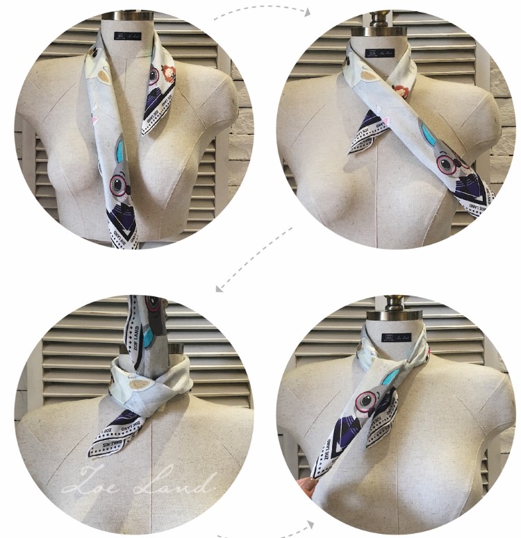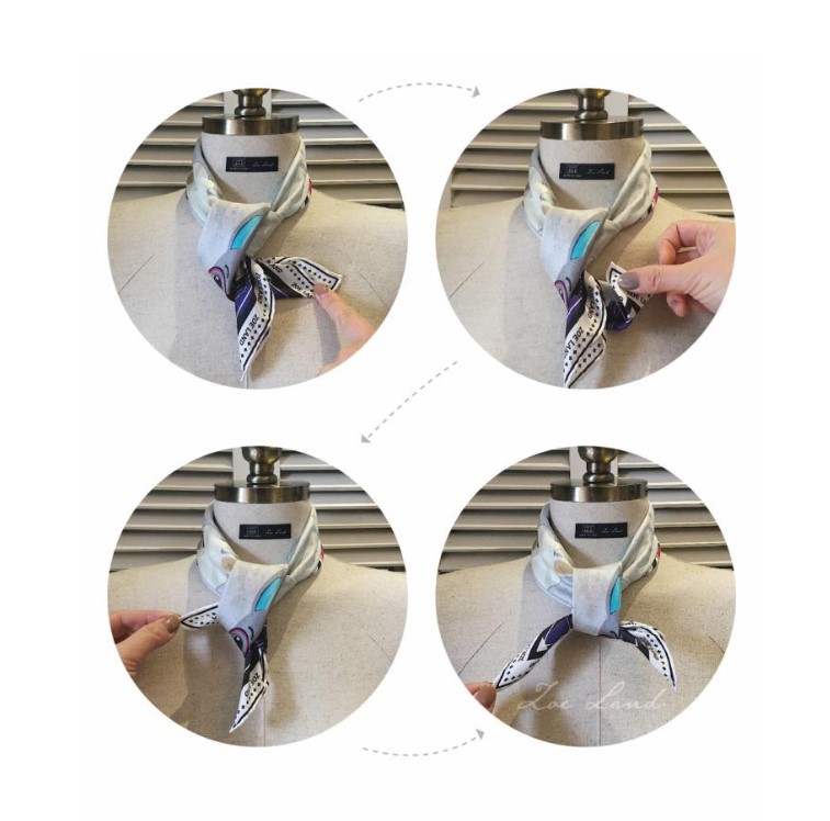 最先说的就是打平结,简单来说其实就是打两个活结,首先把小方巾对折卷成长条形,然后把长条放到脖子上连续打两个结,这样就可以了,是不是很简单。如果是脖子怕冷或者追求时髦的小姐姐,下面这种方法就比较是适合你们,就是把45小方巾系成Choker,方法跟打两个结类似,需要再加一步:打好结之后把留下的角卷进去就ok了。