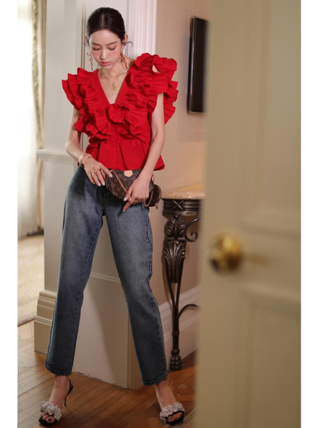 性感的红色V领衬衫,显露出妹子撩人的锁骨,甜美中又带点小性感,袖子是开叉系带的设计,看起来真是时尚性感极了,下身再搭上一条纹九分的直筒裤,显身型的同时还显得妹子格外的迷人呢。