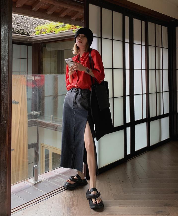 2、红色衬衫+黑色小背心+女士牛仔裤。很是宽松的一款红衬衫,很有休闲风的味道,红色的格子衬衫,带着靓丽之感,也有着小清新的感觉,这样的一款衣服,可单穿,可当薄外套搭配T恤、小背心小吊带都是可以的。