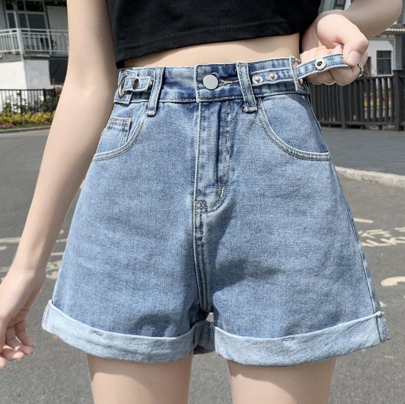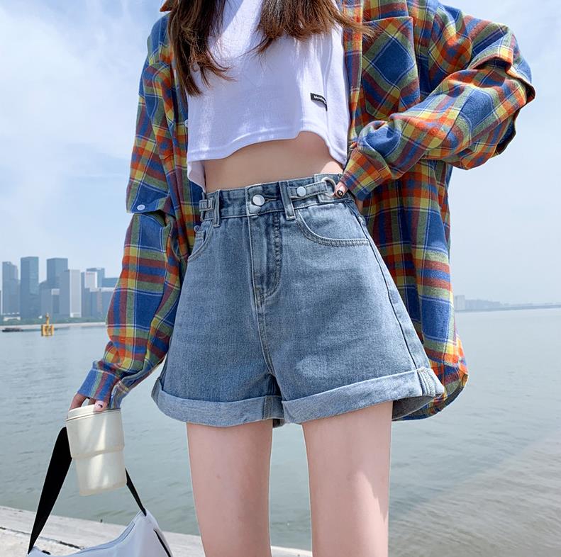 2、韩版牛仔短裤 韩版的牛仔短裤一般是A字型的,即裤腿较宽,收腰较紧,这样能够营造出腰细的感觉,是不错的选择。