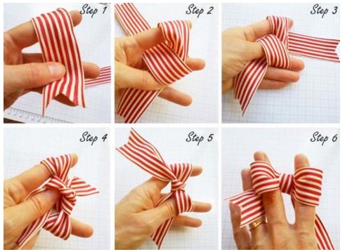 首先我们把丝带两段交叉在一起,然后把上面的一端拉长,然后再将长的一端从端的一端的下面向上穿过去系成一个结,另外较短的一端向着反方向打成一个环的形状,接着将刚才从下面穿过来的一端绕过这个环,将这一端丝带的中间部分从上面穿过去,这样蝴蝶结就完成啦。