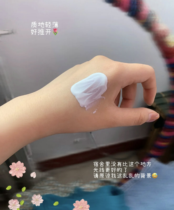 如霜质地,上脸超级水润,对于我这种敏感肌肤也很友好,涂在脸上超级温和的,也没有过敏情况发生,奈斯~~而且很容易推开,完全不会假白,成膜速度也很快哦,SPF50+/PA++++的防晒力度在夏天也是完全ok的,就算出去玩耍也不怕晒黑了!
