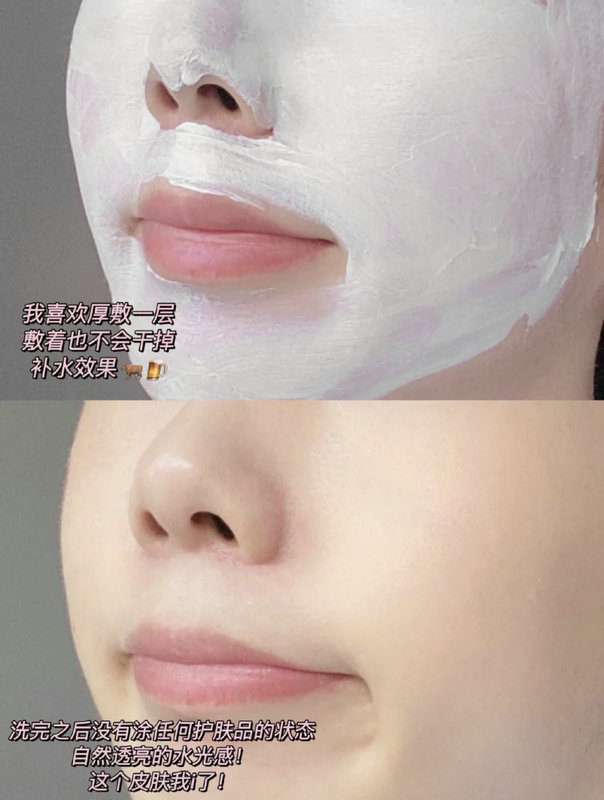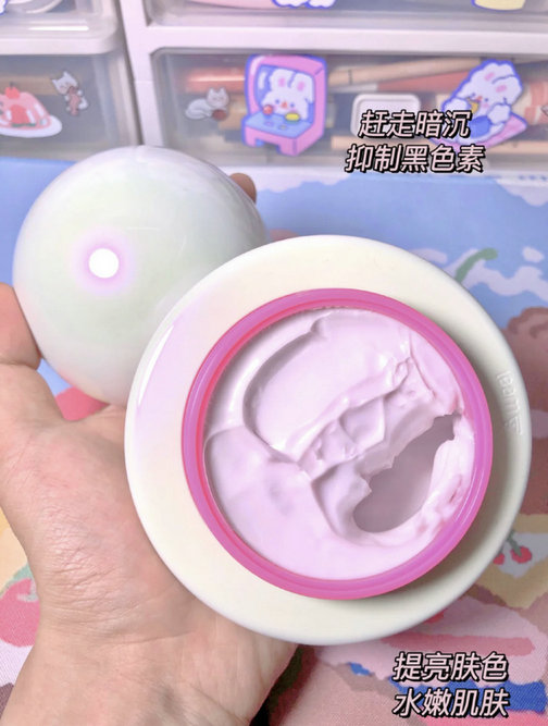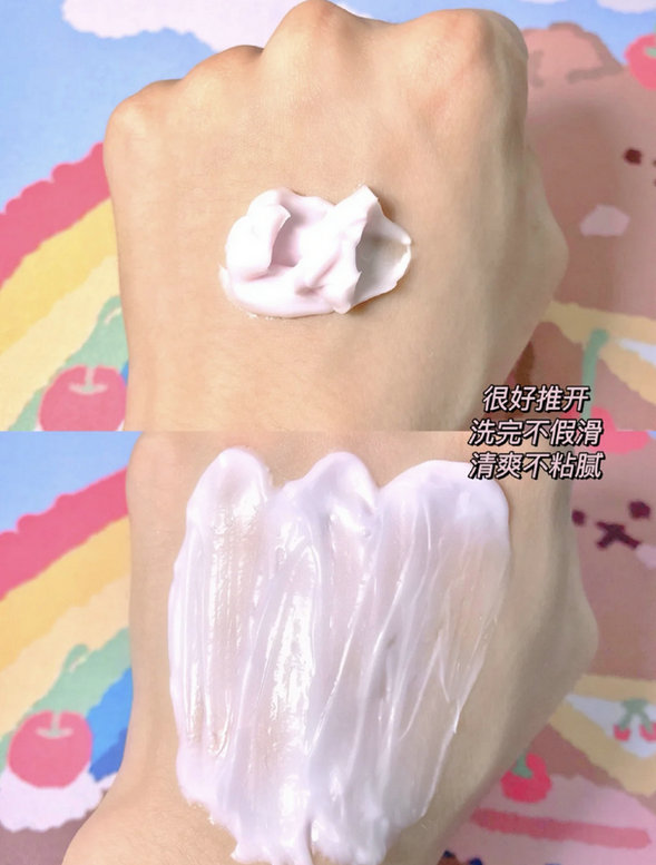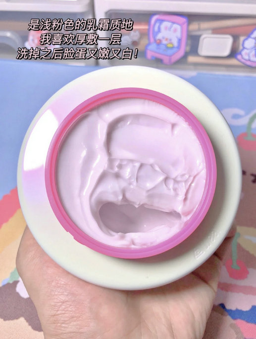 它是乳霜质地的很细腻,抹开水润不油腻也不会厚重,涂在脸上也不会干掉,我喜欢厚敷一层!洗完就是白煮蛋,睡得再晚第二天醒来还是白白的!