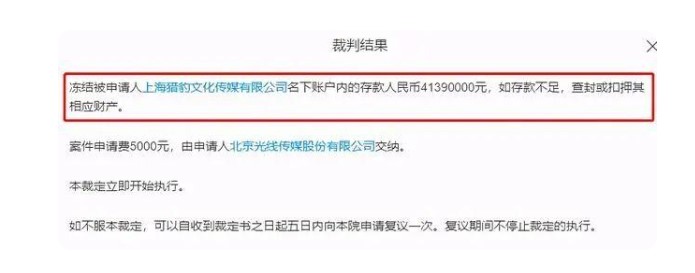 天眼查APP显示,此次被执行关联案件为北京光线传媒股份有限公司与上海猎豹文化传媒有限公司相关合同纠纷。