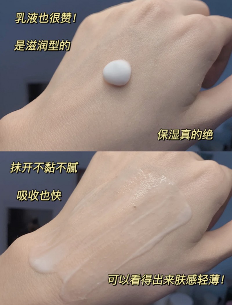 乳液是牛奶般质地,润润的,一抹化水,吸收敲快,用完皮肤Q弹细腻~水乳搭配用了一段时间,即使熬夜,皮肤也没以前那么暗沉了,素颜很透亮,闭囗也基本消了,整张脸仿佛磨皮般干净水嫩,对啦,这套成分温和不刺激,和我一样的敏感肌bb,放心用就完事了!