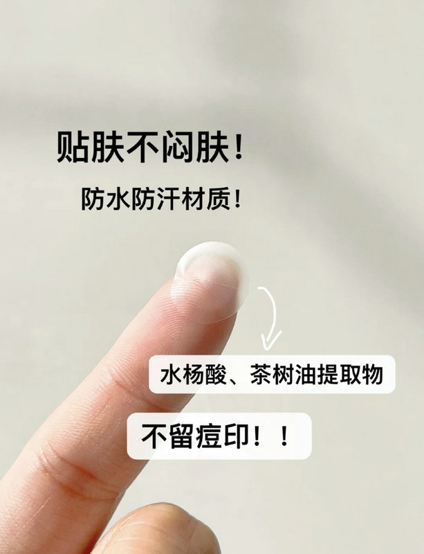 主要是里面含有水杨酸、茶树油提取物可以破坏痘痘生长环境不让它继续长大后面也不会留印子!比较贴合皮肤的水胶体材质防水防汗帖在脸上的很隐形边边不会翘起来上班非得化妆的话,美观的。又不用担心给皮肤负担。