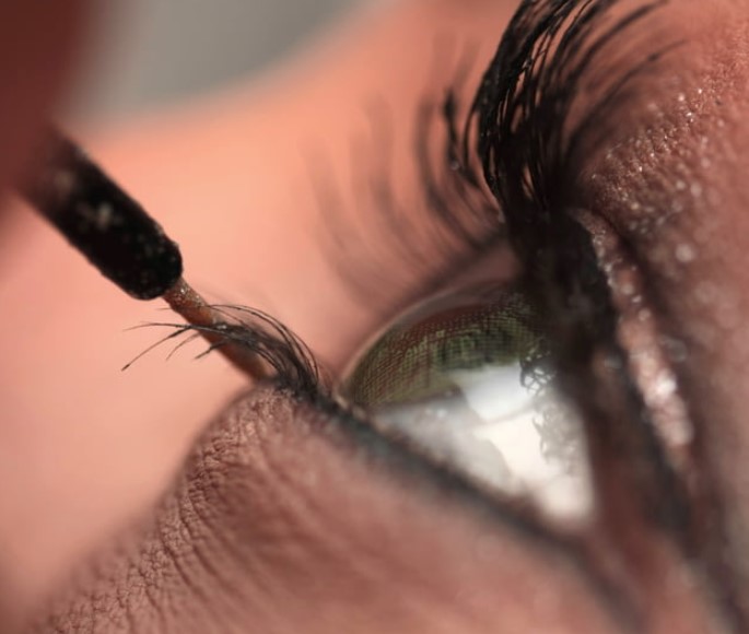 接着是眼妆。开始画眼影,再画内外眼线。然后用睫毛夹让睫毛更加卷翘,睫毛定型后再次刷睫毛膏。