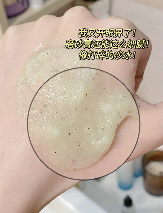 它的颗粒不大,但是又是那种细密的感觉,所以它的清理力很强,适合角质层厚的姐妹。之前角质层比较厚的时候,洗澡时在皮肤上直接涂上轻轻地打圈1-3后冲洗掉很滑,用一次你就会爱上,洗完后会留香很久太适合夏天了~