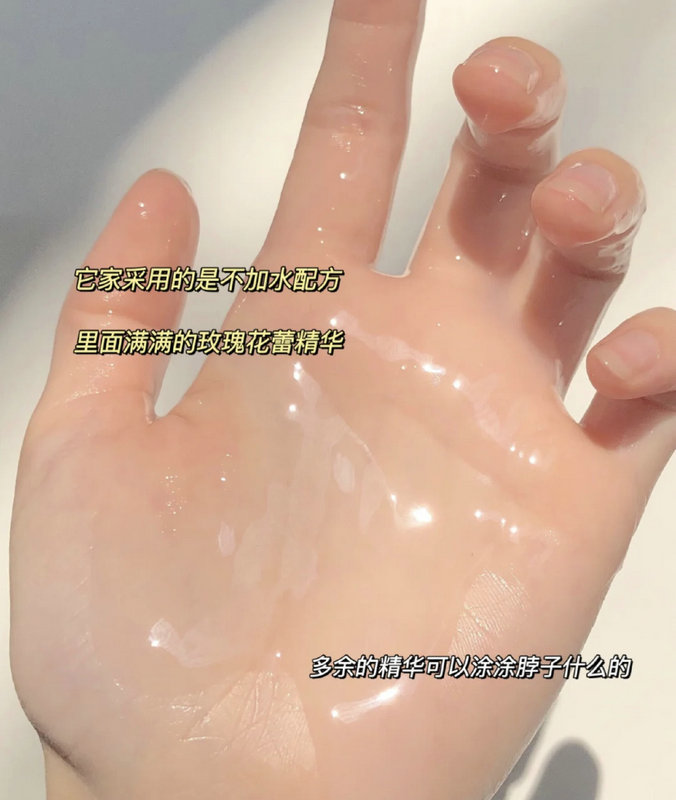 还有!它家采用无水配方,整张面膜不加一滴水的,里面满满都是玫瑰花苞精华!而且成分简单用起来很安心!