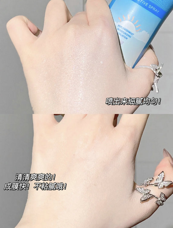 喷在身上冰冰凉凉的,还能降温呢,推开轻薄水润一会就成膜啦,在身上好清爽!还能自然提亮肤色。