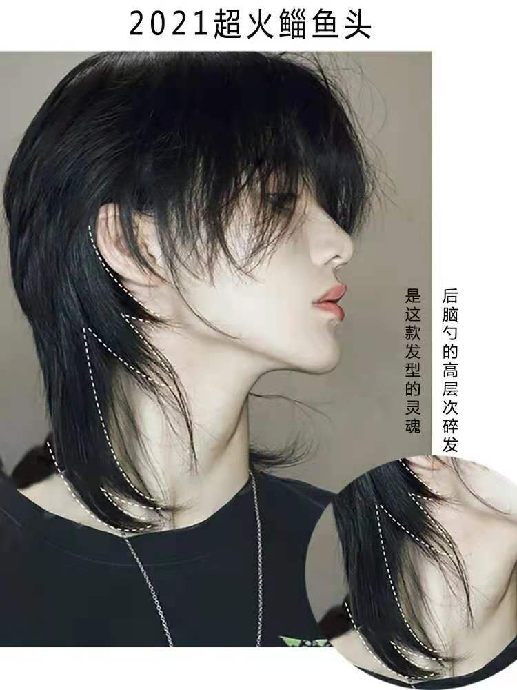 因为后颈区发尾参差不齐留在脑后,就好似鲻鱼的尾巴,所以叫鲻鱼头。正面看和普通发型差不多,但从侧面和背后看,就是另外一种风格的发型了。