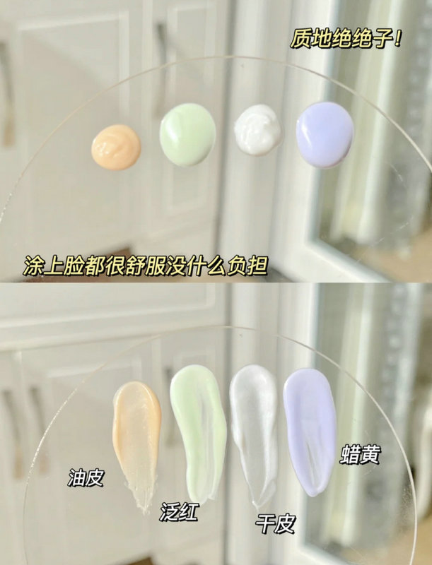 紫色这只买它!涂上就是直男眼中的素颜好皮肤,质地很水润心完全不会卡粉,不会假白,皮肤好到像开了美颜滤镜,后续上妆也贼服帖,不会和粉底打架,融合的太好了,真百搭王。