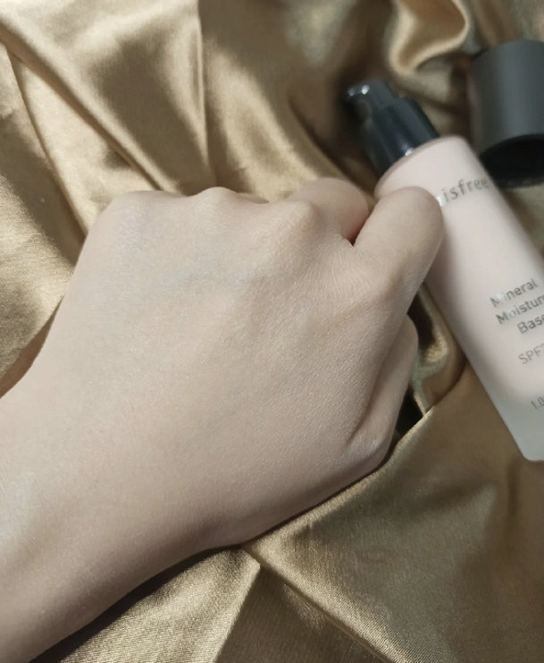 质地轻薄,轻轻推开,延展性非常好,也说明其清爽的质地;均匀拍打,很快手背肌肤就展现象牙色的柔白光泽,几乎没有负担感。