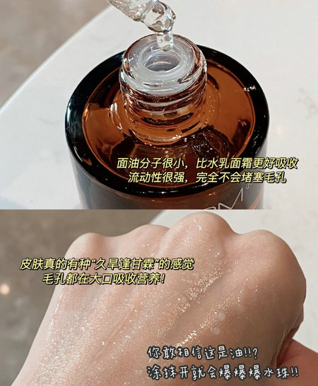 每次一泵挤于手心,捂五秒后按压上脸,吸收飞快,脸上立马舒服了,再用刮痧板按摩,滋润、舒缓,整张脸都舒展开了本来皮肤干到起皮毛孔还可大用了这个精华油给我敏感泛红的脸修复好了,说是干燥敏感肌的救命稻草都不过分。