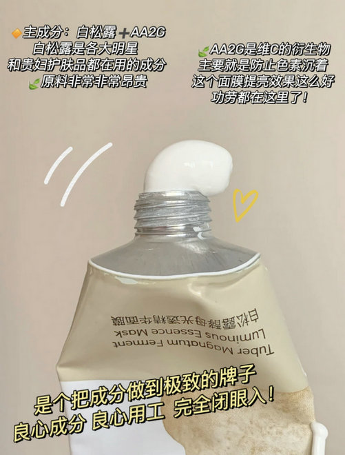 还有AA2G,这俩是这个面膜的核心成分,除此之外还有光果甘草根、牡丹 等等提取物。全通路提亮,提亮界的天花板!而且还补充了大量用来舒缓的植物,成分温和又有效是他家一贯的作风!