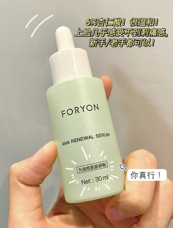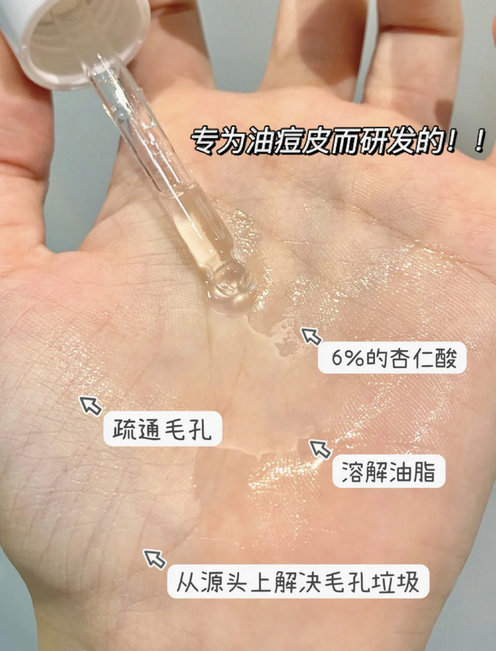 说回这个是果酸类的精华,就是比其他酸类会更温和!里面有6%杏仁酸,温和到不需要建立耐受!上脸不会有刺痛感, 而且,像水状一样清爽,油皮最怕闷和油腻,它就完全不会出现这种状况!!用的时候就当作精华这个步骤来用就行, 色在你T区还有额头和爱长痘的地方涂上,按摩到吸收就行啦!so easy!!