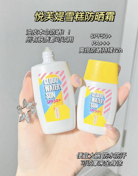 闺蜜推荐了平价好用的防晒霜——悦芙媞雪糕防晒乳。包装就是雪糕的样子,特别可爱。配方是无油无香精的,油皮最怕含有的防晒乳了,会搞得脸很油腻,这款防晒上脸轻盈不油腻。