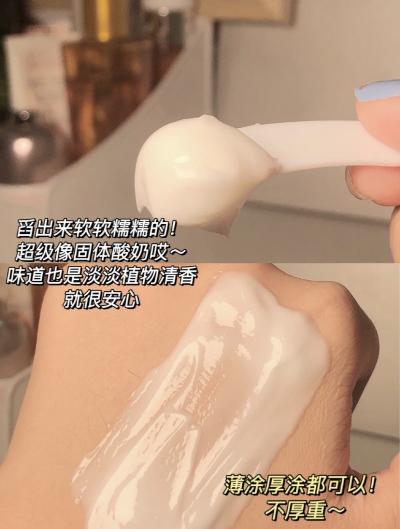 打开后,它的质地很像固体酸奶,软软糯糯的,晚上睡前敷上一层,按摩至吸收就可以入睡啦,免洗睡眠面膜,也比较方便。