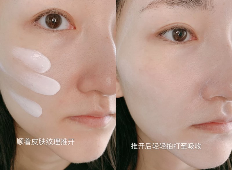 白色乳状,质地像面霜一样,看起来比较厚重,但非常易推开,延展性很优秀,一丁点就能涂全脸。清透不黏腻,上脸迅速成膜,肌肤零感更自由。