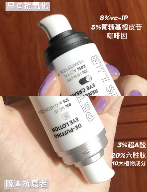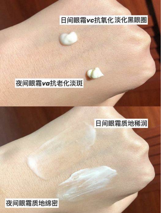 对于眼霜的需求已经不满足于纯保湿这款的功效点明明白白,白天用VC来眼部抗氧化淡化黑眼圈!很适合本水肿星人。质地比较轻薄不会影响后续上妆晚上用VA来抗初老淡眼纹!比较滋润上眼很安心,毕竟白天和晚上对于眼霜的需求是不一样的这点真的很省事。