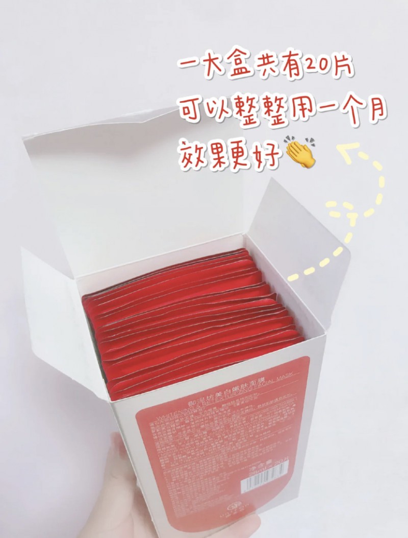 这款面膜一盒20片,包装很大气,产品的主要成分是复配美白精华,是御泥坊特有的由5种中草药精粹复配成的成分,能从晒黑的各个环节进行预防,还能加速已生成的黑色素代谢,另外添加了烟酰胺、传明酸等美白成分,不言而喻主打美白亮肤了。