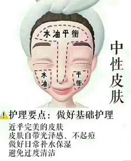 中性皮肤都是细腻光滑富有弹性水嫩嫩的,而且皮肤从来都不会有敏感、长痘、油光、干裂等现象;在上妆的时候也不会出现浮粉的情况。是不是超级羡慕?而且,中性皮肤还有让人羡慕至极的特点,那就是毛孔细小、没有皱纹。另外,中性皮肤很容易受到季节的影响,夏天就会容易偏油腻,冬天就会偏干燥。所以,即使是拥有这样健康的肌肤,还是要注重保养的哦,平常生活作息还是要保持正常哦,睡眠要充足,做好清洁工作及基本保养。也就是说只要随便保养一下,皮肤上没有任何烦恼,此时此刻的你是不是磨刀霍霍向中性肤质的人了?