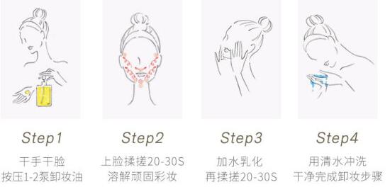three卸妆油使用方法很简单,取适量(按压2~3泵)于手中轻搓温热,从内到外、由下至上涂抹按摩全脸,待彩妆充分溶解后洗净就可以了。