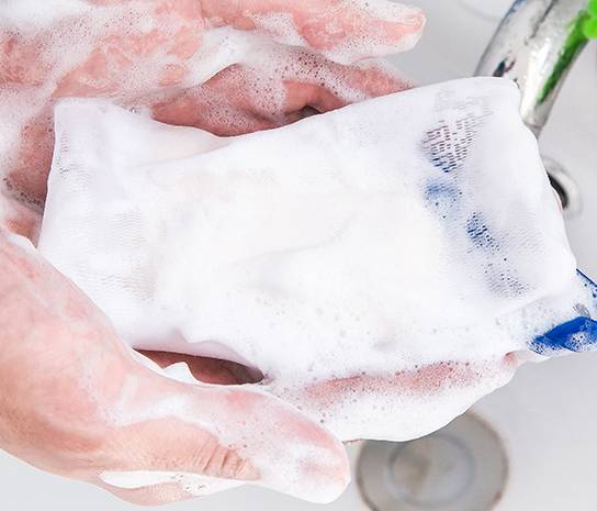 若为固体洁面产品,请将其放入网的中间用双手揉搓即可使其起泡搓出丰富泡沫后,用另一只手挤压网面使用挤出的泡沫洗面。