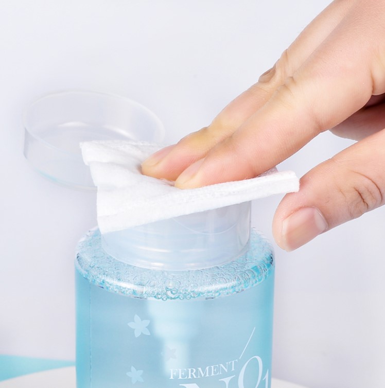 1、将化妆棉蘸满卸妆液,覆盖眼周肌肤,轻轻沿眼部肌肤向两侧擦除眼部彩妆。