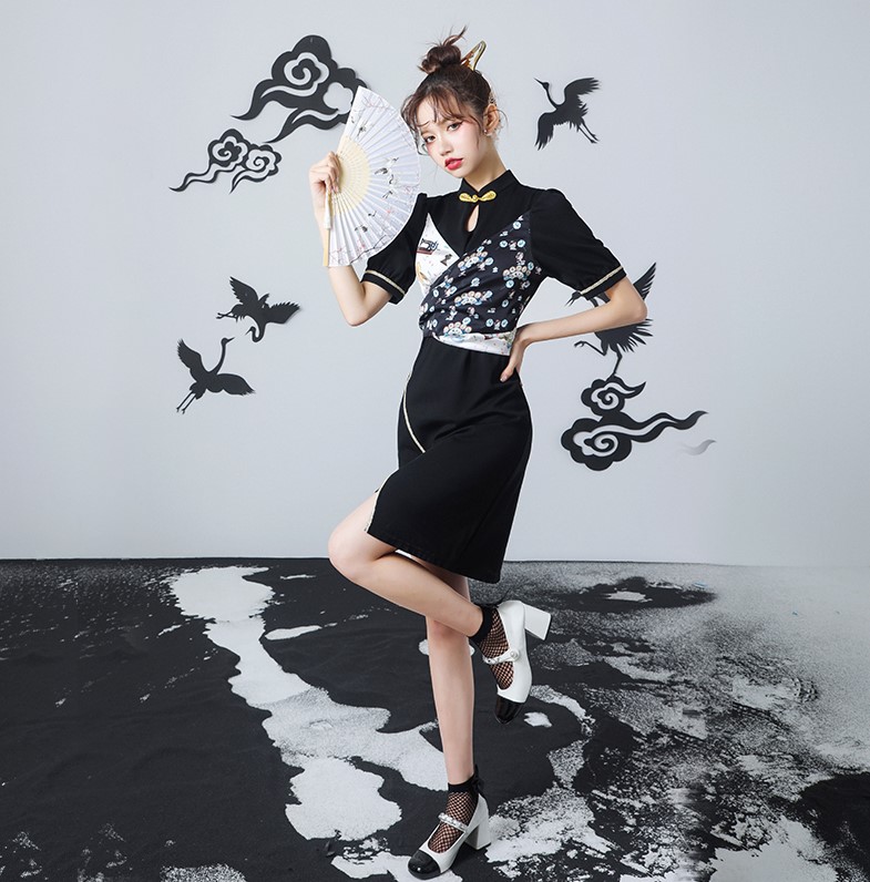 3、无需费尽心思的造型,中分简单的将头发盘在脑后,凌乱的几根任意散落在后颈,搭配印花旗袍,优雅性感更增添几分魅惑。