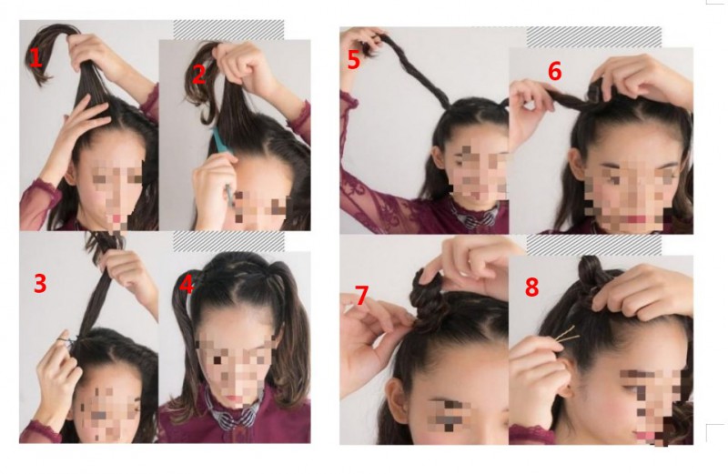 Step1:将头发分成两部分相等的发量,然后梳成双马尾;