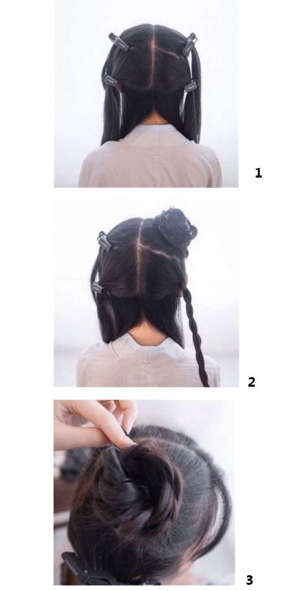 将头发分区,并用发夹固定隔离。把右边头发编两个三股辫,稍微松一些,将上面的一个三股辫盘起来。将下面的三股辫拧起来,放在盘好的发髻后面,并用钢卡固定住。头发的另外一边,按照以上相同的流程进行处理,这样简单的汉服发型就完成了。