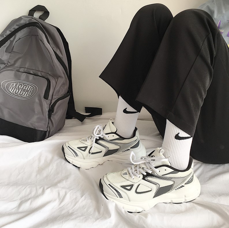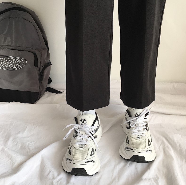 鞋带的穿法可以选择简单的蝴蝶系法或者把鞋带绑进鞋子里面使用鞋舌掩盖起来,五芒星的系法简单也好看,老爹鞋搭配西裤也是很不错的选择,显腿长百搭,束脚裤搭配运动裤就是前几年很流行的一个穿法了。