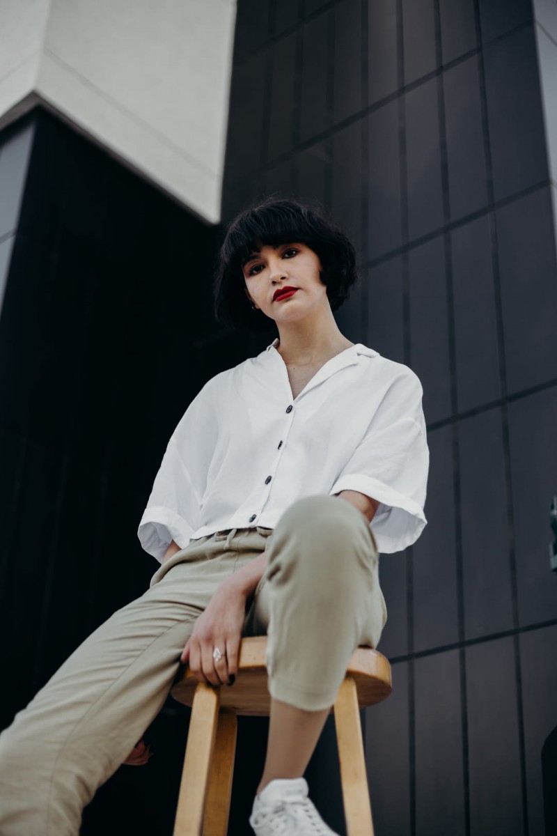 如果想要特别一点,有设计感一点的白色衬衫,再搭配有设计感一点的半身裙。如果真的觉得白衬衫太沉闷死板了,现在也很流行有“设计感”的衣服,不妨选择那些有设计感的白衬衫吧,例如衬衫的领子、袖口和下摆都可以做一些改变,打破沉闷。与此同时,再搭配上有设计感的半身裙,配上一双马丁靴,不仅不死板沉闷,还会显得特别酷的。