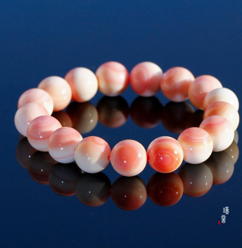 通常会被做成饰品,在珠子上是带有螺旋纹路的,雕件上也是粉白黄相间,一般是整片艳丽的粉色一面粉一面白的是比较常见的。